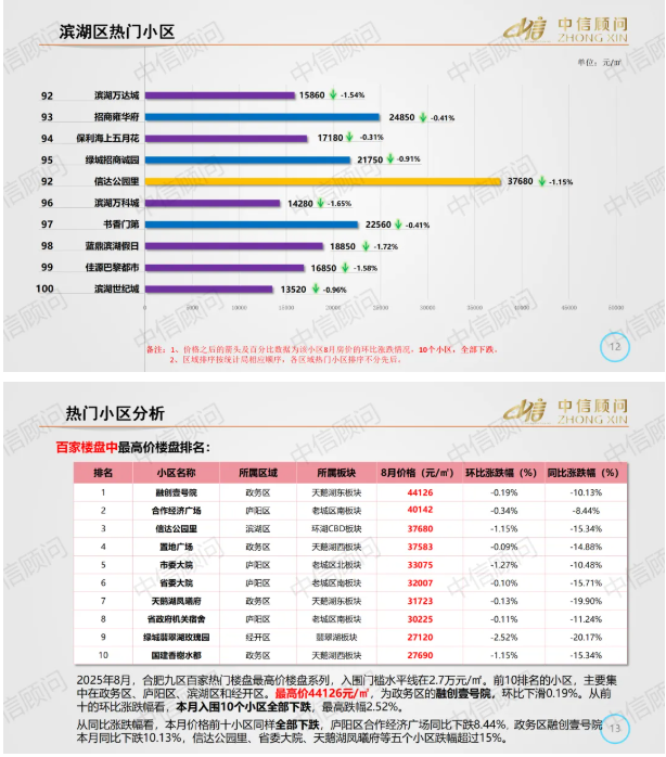 二手房市場 | 2025年8月,合肥百家樓盤環比98下跌2上漲,環比下跌小區數量增加