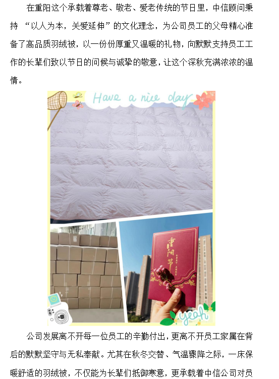 溫情暖重陽(yáng) 被暖父母心 ——中信顧問(wèn)重陽(yáng)暖心慰問(wèn)